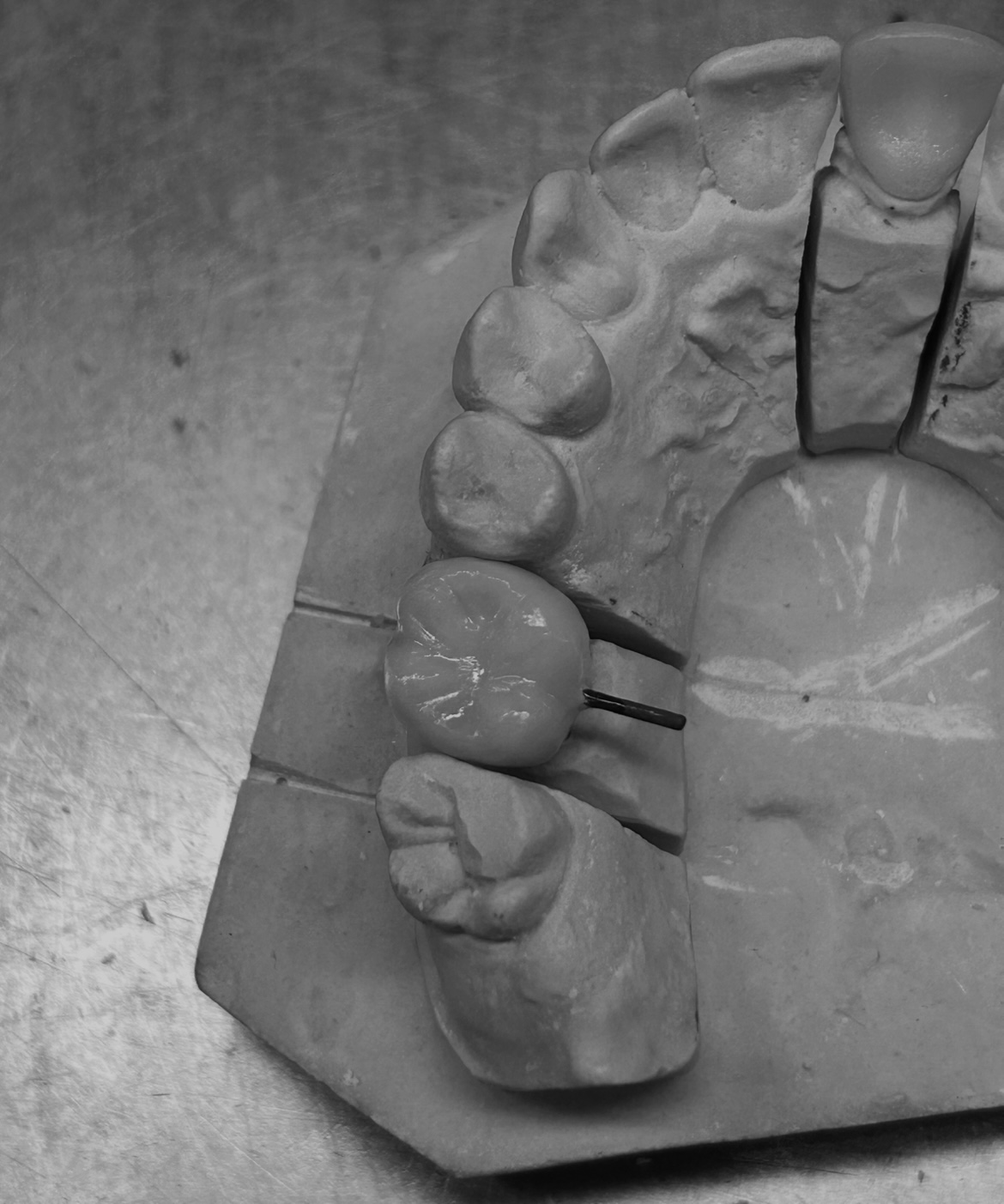 Una vez hayamos terminado con la colocación de la cerámica, repasamos con la fresa de cerámica hasta dejar la superficie completamente lisa y asegurándonos de que la pieza encaja y ajusta correctamente y nada de la cerámica interfiere con el modelo. También comprobaremos la oclusión.
