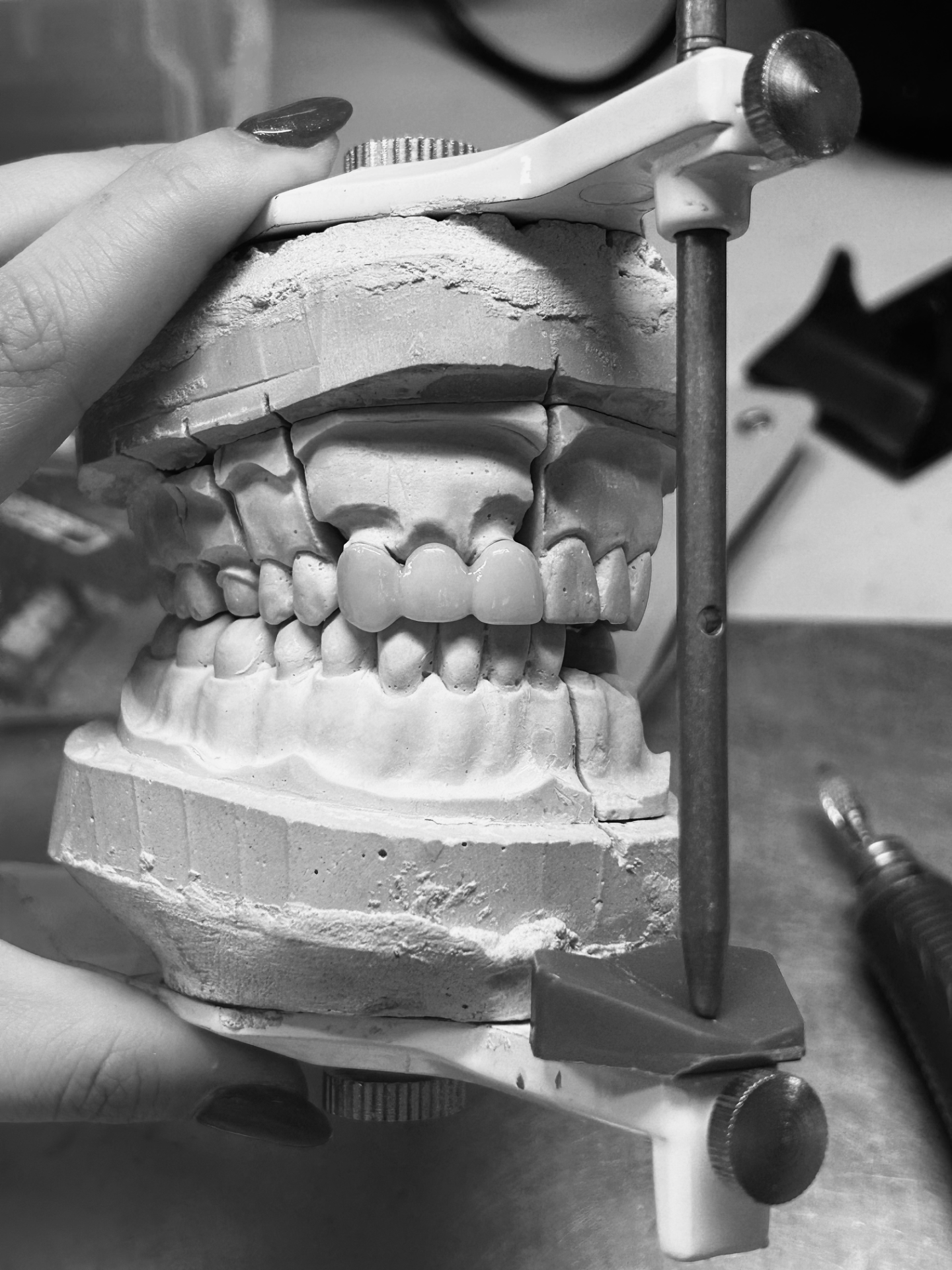 Consiste en una restauración de tres piezas, en este caso de un incisivo central, un lateral y el canino, en metal cerámica. La restauración se sustenta sobre dos pilares que son dos piezas reales talladas creando así los muñones. Primero crearemos la estructura metálica y luego cargaremos cerámica dando así la anatomía a las piezas.